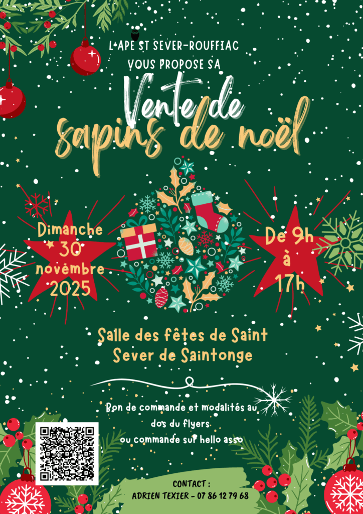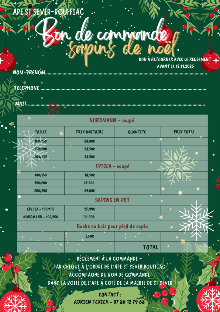 Pour commander les sapins de Noël retourner le bon de commande avec le réglement avant le 12 novembre 2025 pour une livraison le dimanche 30 novembre 2025 entre 9h et 17h :